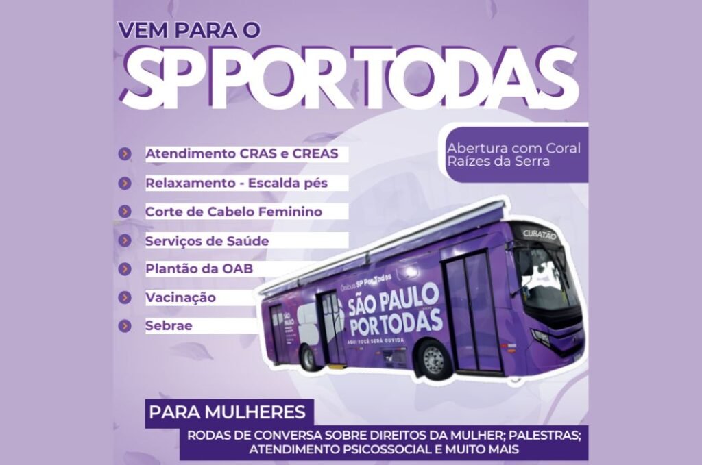 Cubatão recebe, nesta segunda-feira (9), o ônibus do São Paulo Por Todas, do Governo do Estado, com apoio da Secretaria Municipal da Mulher e dos Direitos Humanos. A programação ocorre das 9h30 às 18h, no Centro Esportivo Romerão, na Rua Embaixador Pedro de Toledo, 333, Centro. A abertura contará com a participação do Coral Raízes da Serra da Terceira Idade.