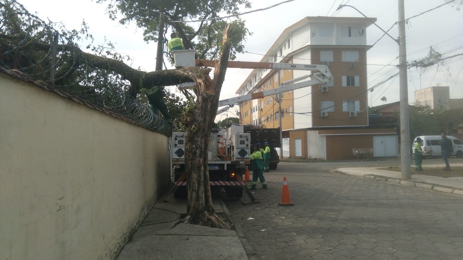 Equipes da força-tarefa realizaram a remoção da árvore caída no Jardim Nova República. A Avenida Deputado Emílio Justo passou pelo processo de nivelamento dos sextavados.