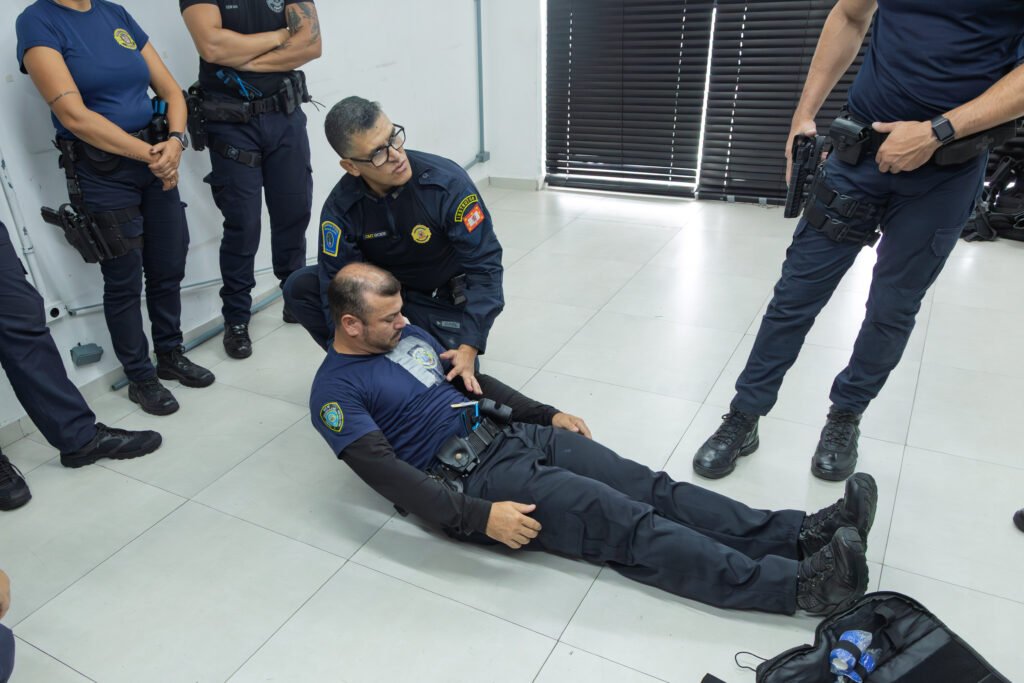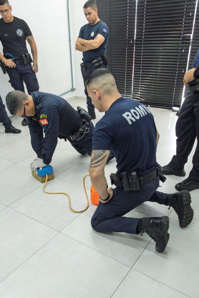 O conteúdo programático contemplou fundamentos legais, reações fisiológicas sob estresse, técnicas de retenção de arma curta, procedimentos de algemação e imobilização, noções de Atendimento Pré-Hospitalar (APH) Tático, além de simulações práticas voltadas ao contexto real de atuação. Durante as atividades, foram abordadas táticas de retenção e combate, com foco na aplicação de técnicas de controle e neutralização de um possível agressor, utilizando golpes contundentes e estratégias que impeçam a movimentação involuntária da arma e a ocorrência de disparos.